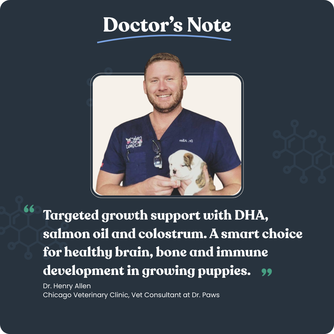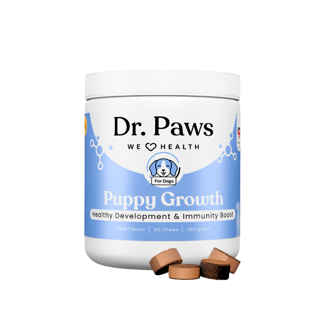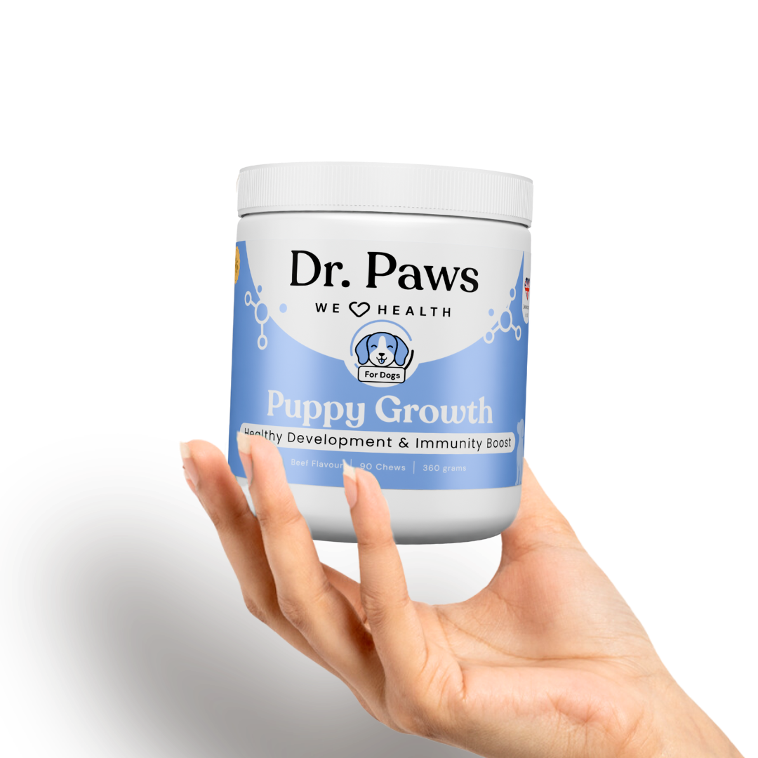 Dr. Paws Puppy Growth is a daily developmental chew crafted with ocean seaweed extract, salmon oil, DHA/EPA, collagen bone broth, reishi mushroom, and dairy-based nutrients to help maintain healthy growth during the most important stages of your puppy’s life. Designed for growing dogs of all breeds, it supports bone strength, brain development, digestion, immunity, and coat health.