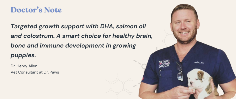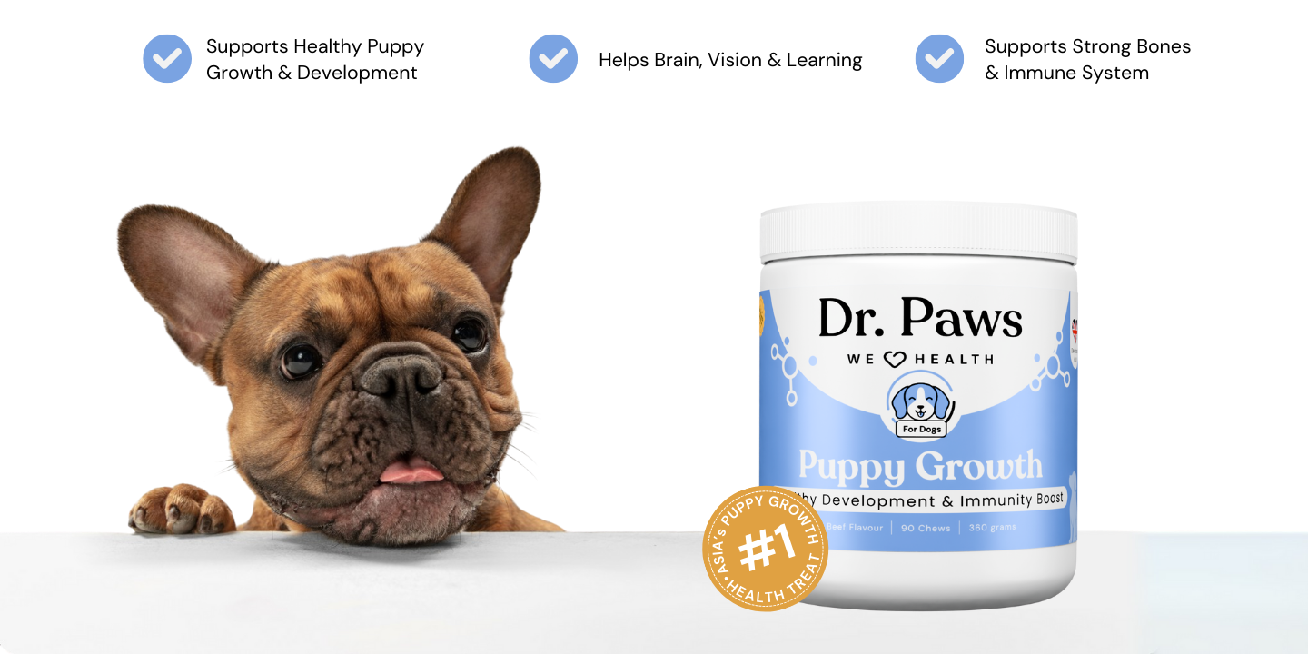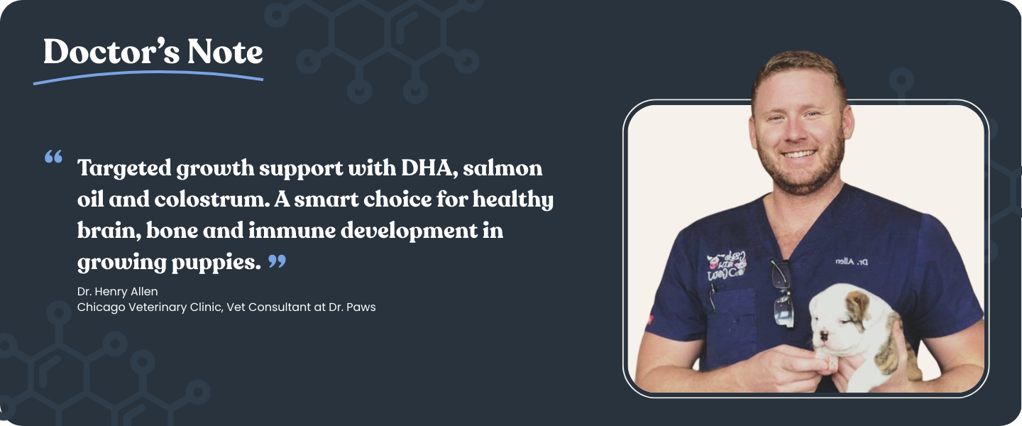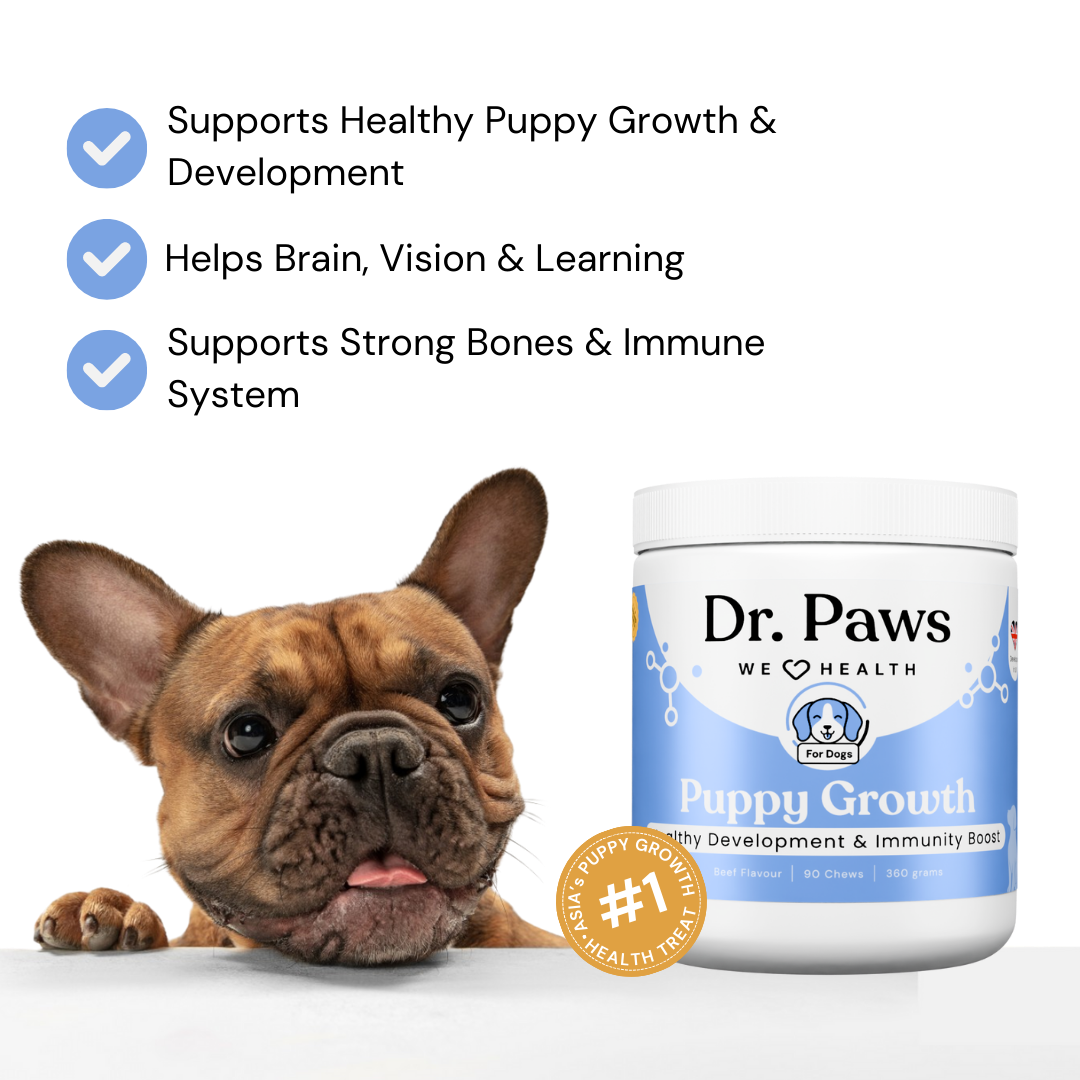 Dr. Paws Puppy Growth is a daily developmental chew crafted with ocean seaweed extract, salmon oil, DHA/EPA, collagen bone broth, reishi mushroom, and dairy-based nutrients to help maintain healthy growth during the most important stages of your puppy’s life. Designed for growing dogs of all breeds, it supports bone strength, brain development, digestion, immunity, and coat health.