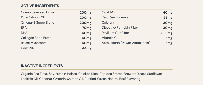 Inactive ingredients: Organic Pea Flour, Soy Protein Isolate, Chicken Meal, Tapioca Starch, Brewer’s Yeast, Sunflower Lecithin Oil, Coconut Glycerin, Salmon Oil, Purified Water.